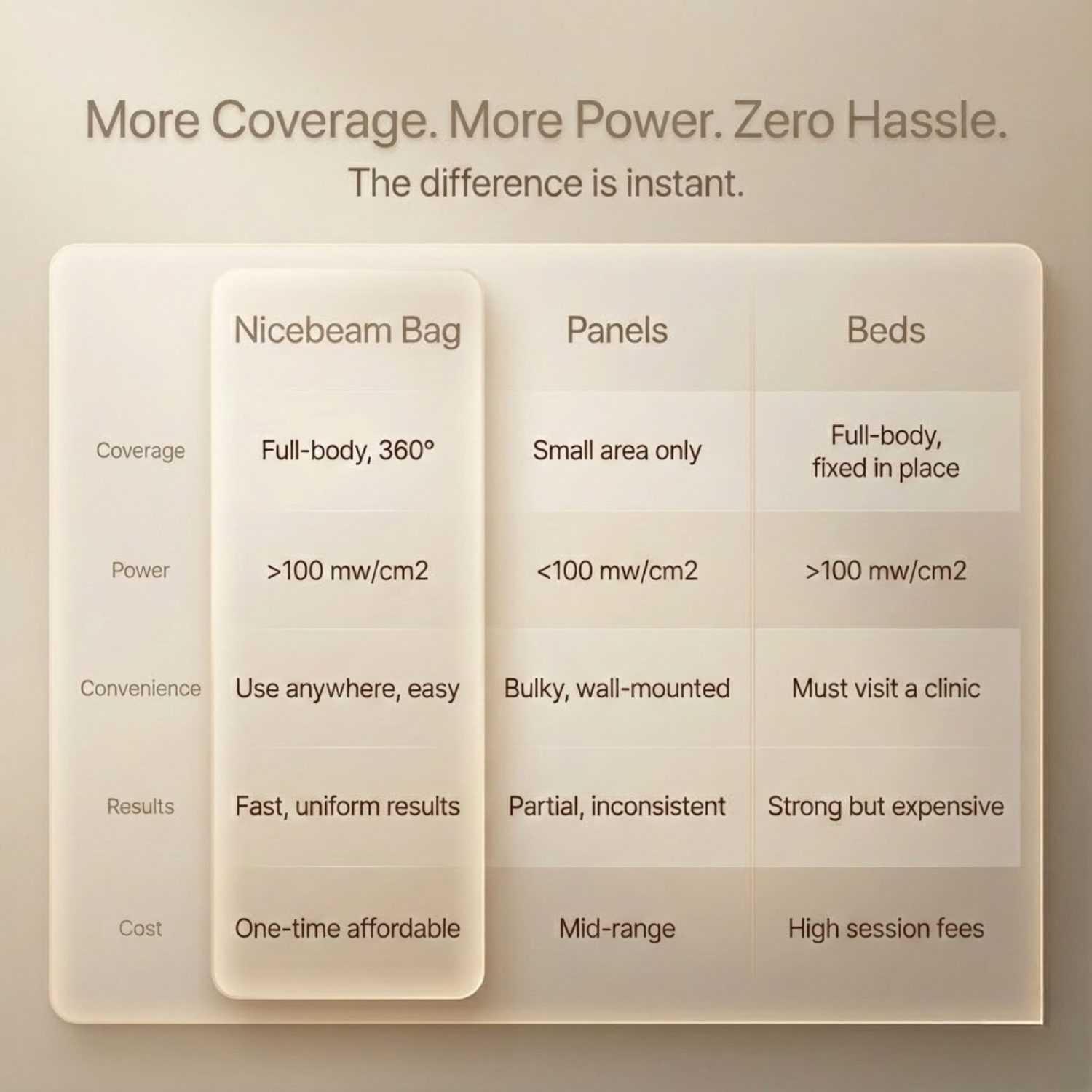 Cheap panels look bright but barely reach your cells, so you lie there forever and feel nothing. NiceBeam hits up to 130 mW/cm² at the surface, so more light actually gets in, and you get a full session in minutes, not an hour.