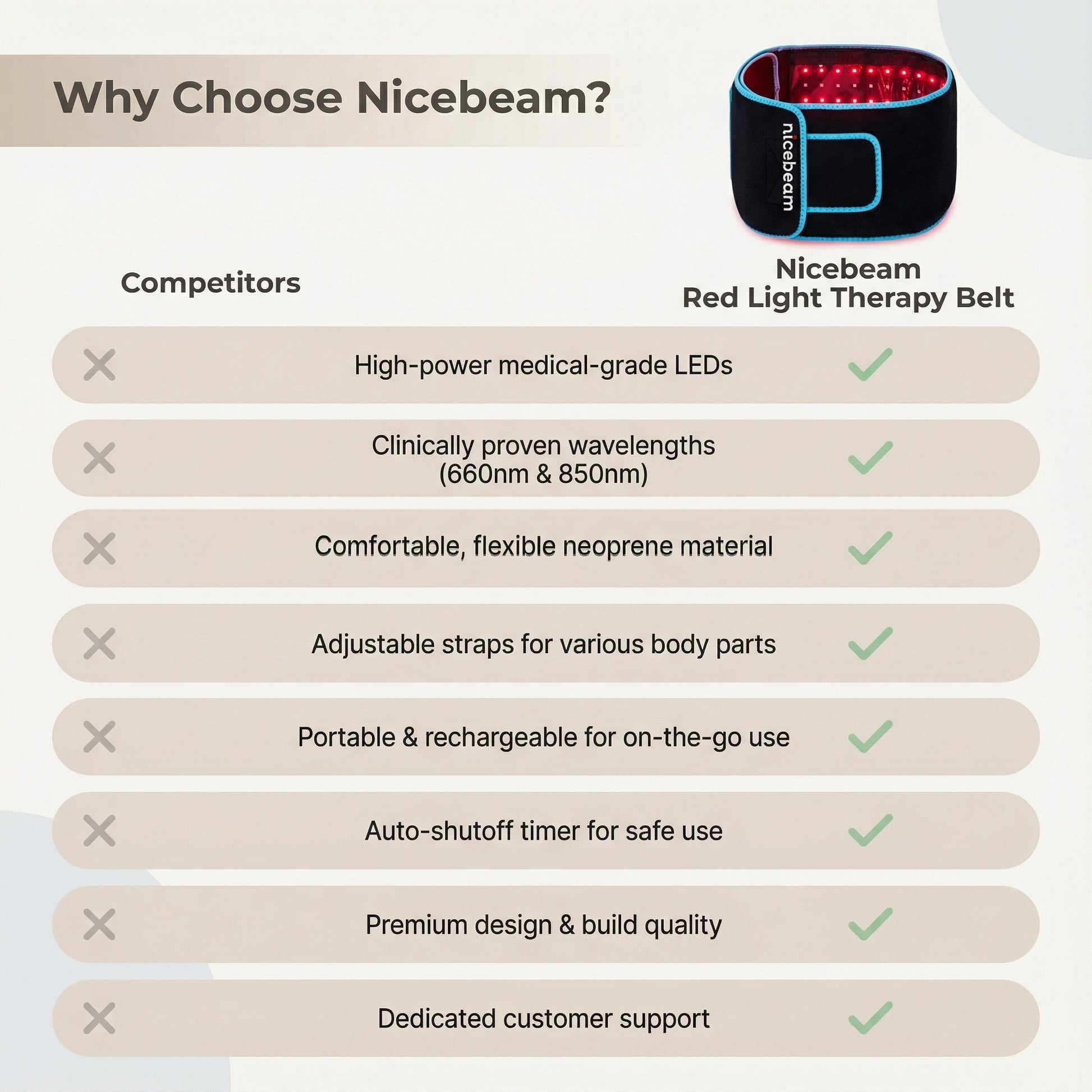 Nicebeam doesn't recommend red light therapy for anyone with photosensitizing medical conditions, such as lupus, or anyone taking a photo-sensitizing drug (including tetracycline, doxycycline, hydrochlorothiazide, naproxen). You should also avoid it if you have any open wounds or lesions on your skin.